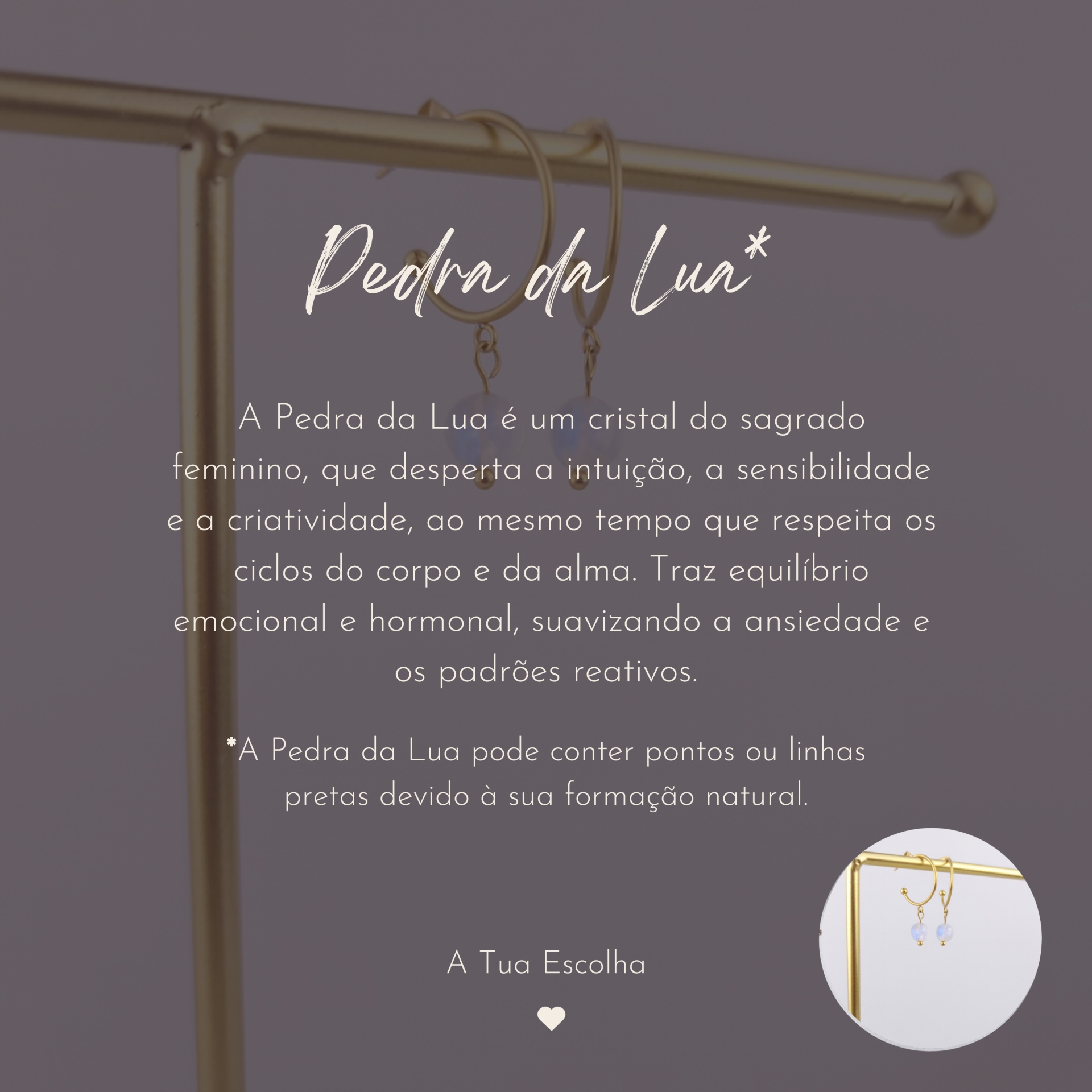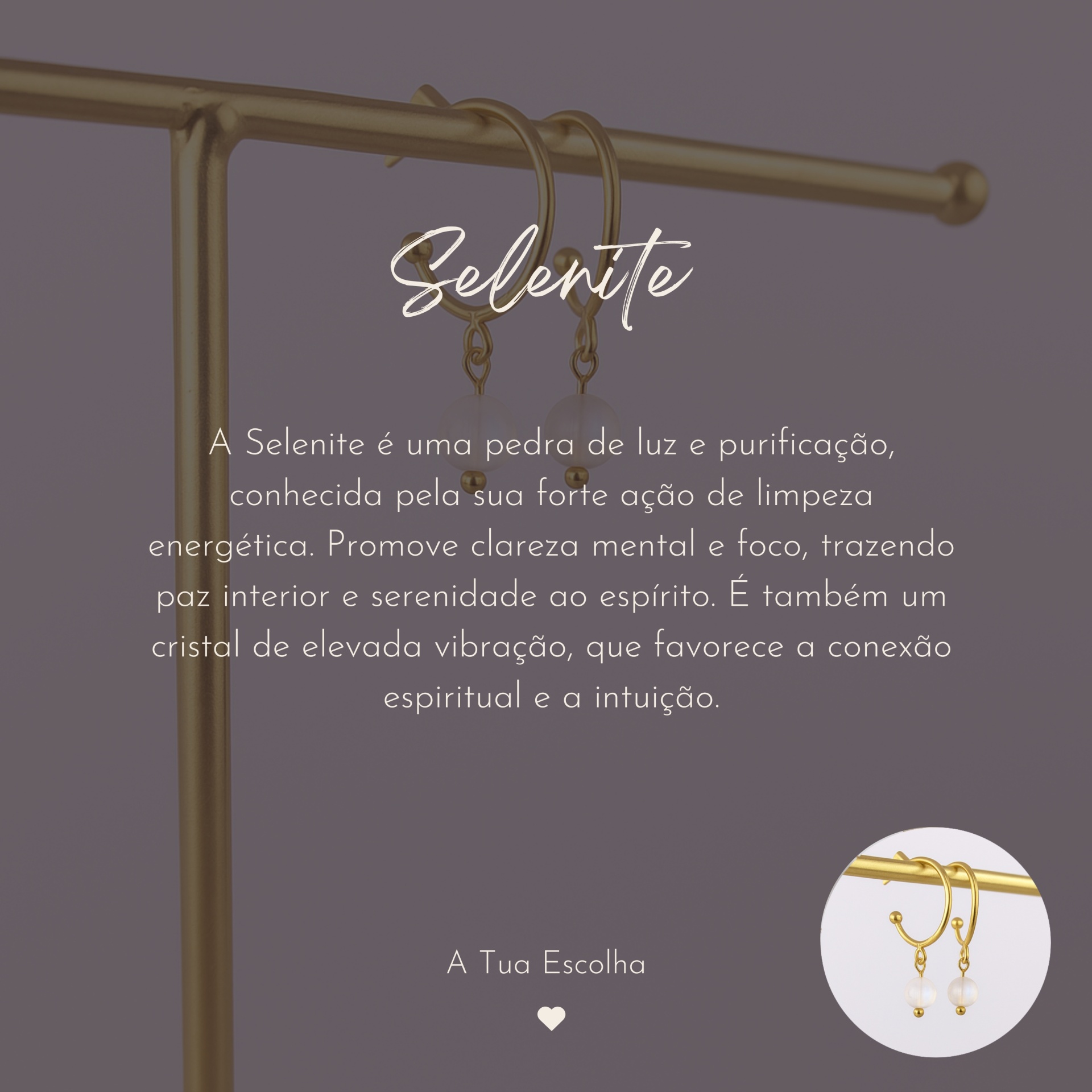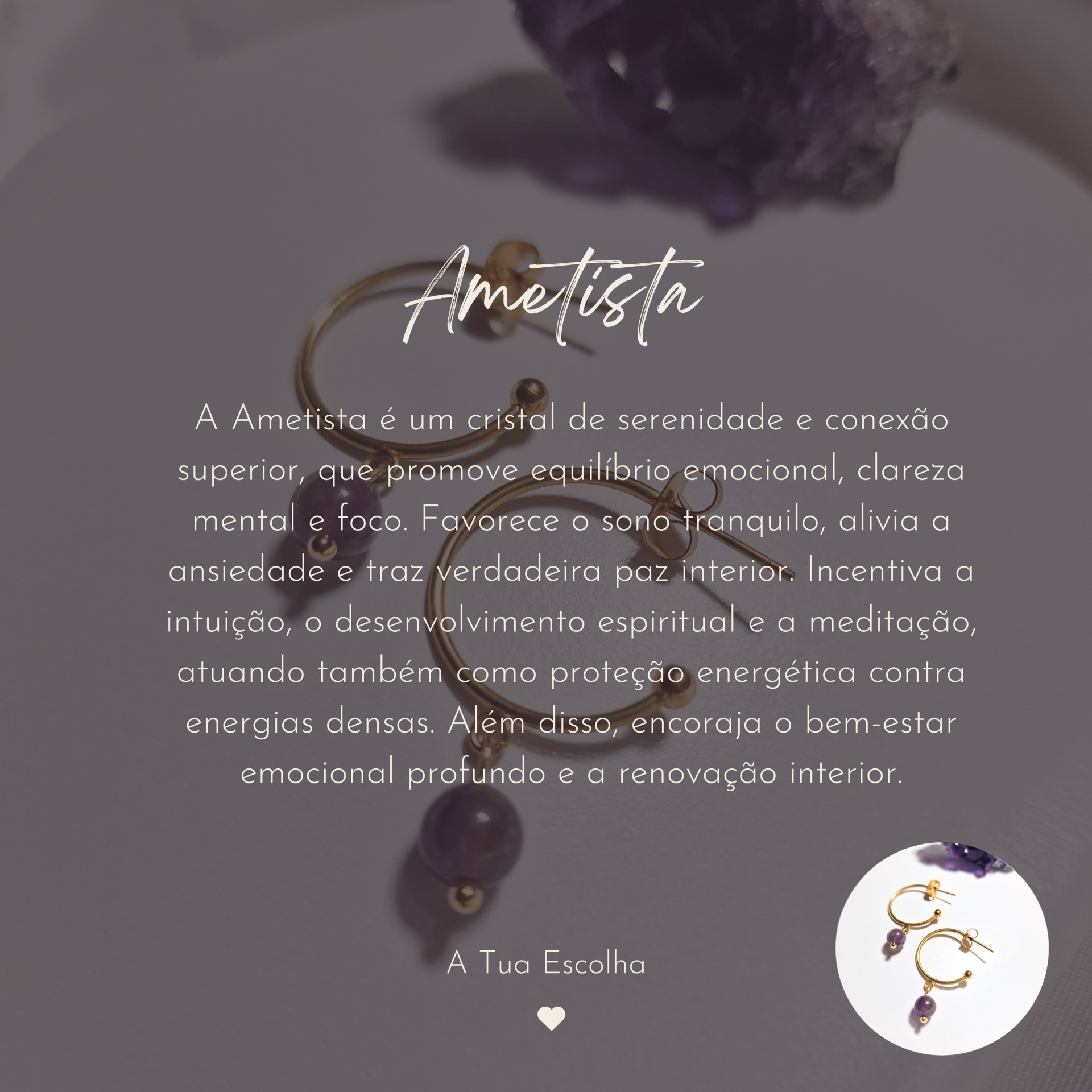 Estes brincos são produzidos em aço inoxidável banhado a ouro, unindo a energia do cristal à durabilidade — pensado para acompanhar-te em todos os momentos da tua jornada.