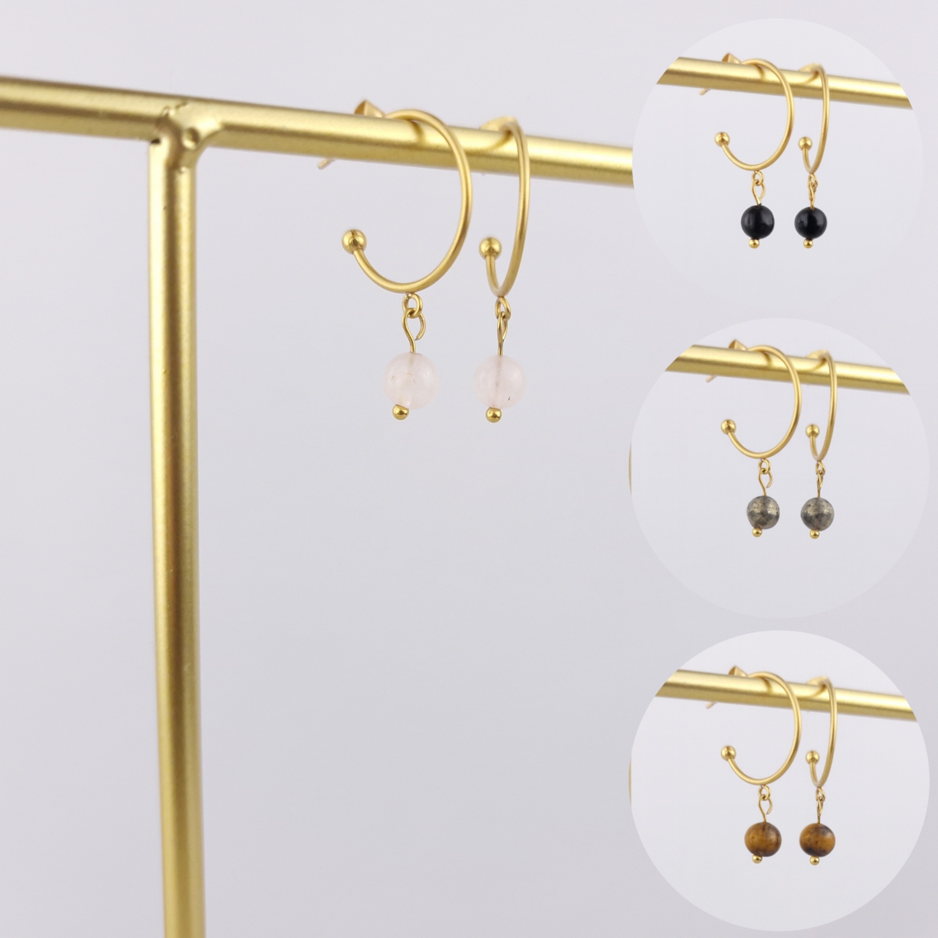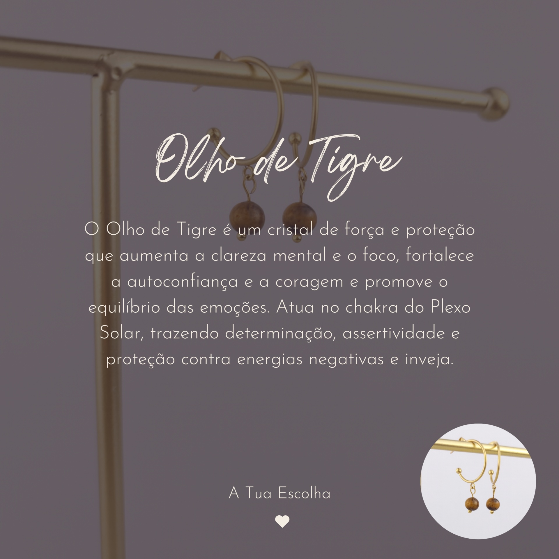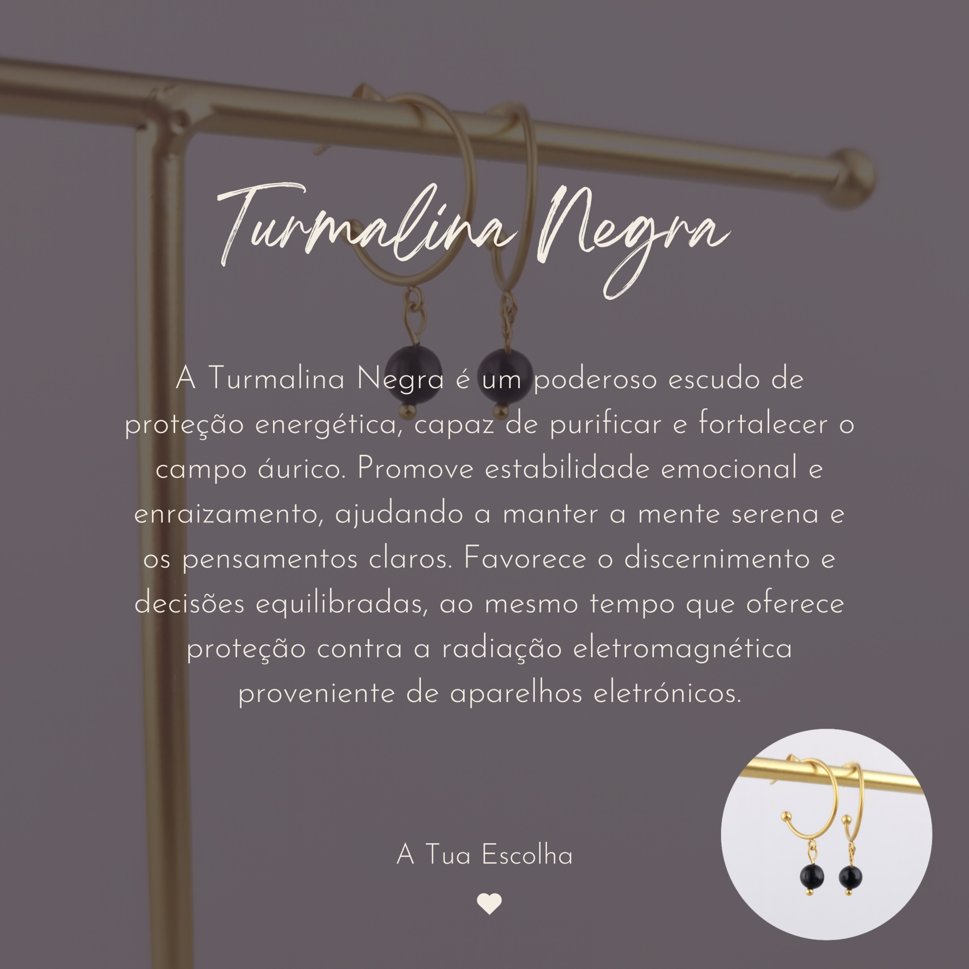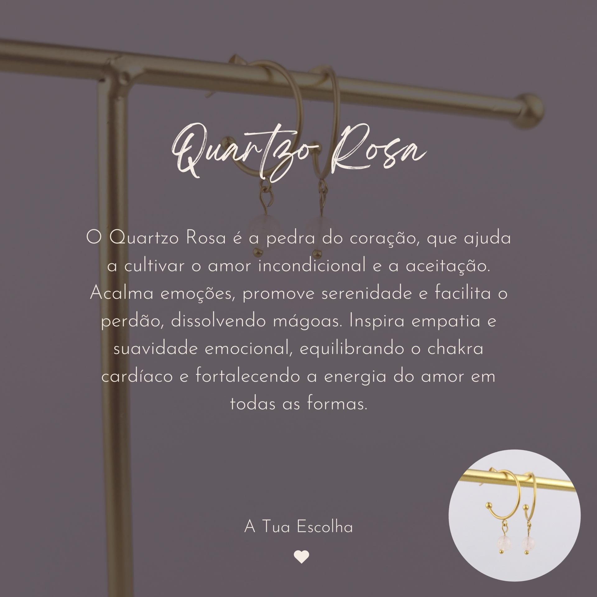 Estes brincos são produzidos em aço inoxidável banhado a ouro, unindo a energia do cristal à durabilidade — pensado para acompanhar-te em todos os momentos da tua jornada.